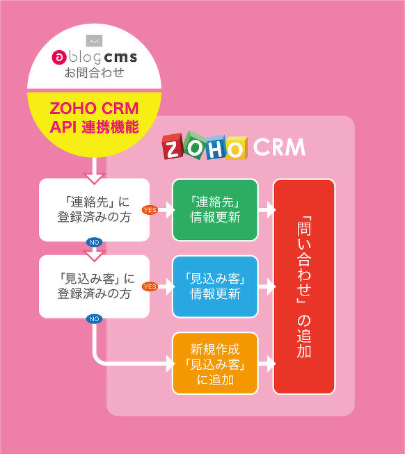お問合わせフォームや資料請求フォーム、求人フォームがブログごとに別れていて、全てのフォームの情報を取得したい場合は各ブログに拡張アプリZohoを連携させる必要があります。