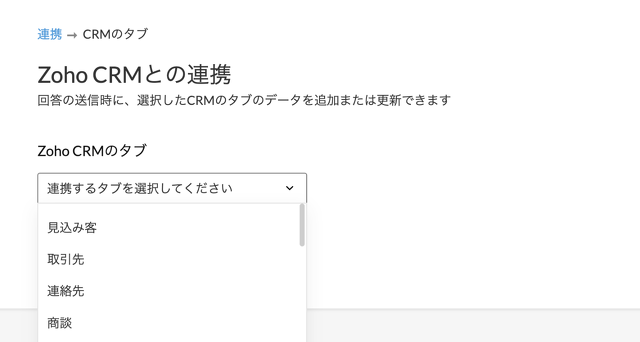 Zohoでは連携させたいタブを指定することでお問合わせ内容を取得しています。