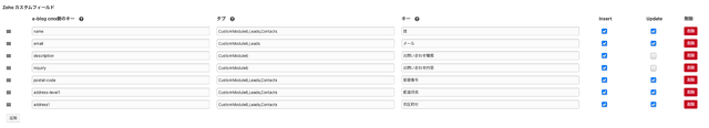 カスタムフィールドの設定でa-blog cmsのフォーム側の変数とZoho側のカスタムフィールドの紐付けを行います。この設定により、お問合わせフォームの情報をZoho CRMに取り込むことができます。
