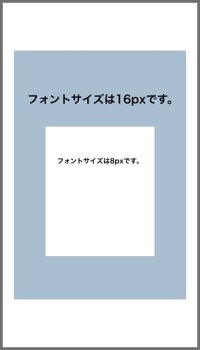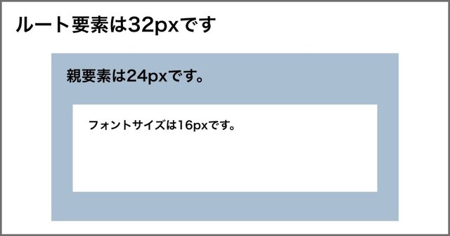 ルート要素が32pxで小さい白枠に0.5remを設定した場合、1番近い親要素のフォントサイズに関わらず32pxの50%となるためpxに直すと16pxとなります。