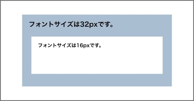32pxのフォントサイズの枠を親に持つ子要素の枠にフォントサイズを0.5emで指定すると親要素の50%の値となるのでpxに直すと16pxとなります。