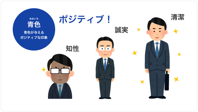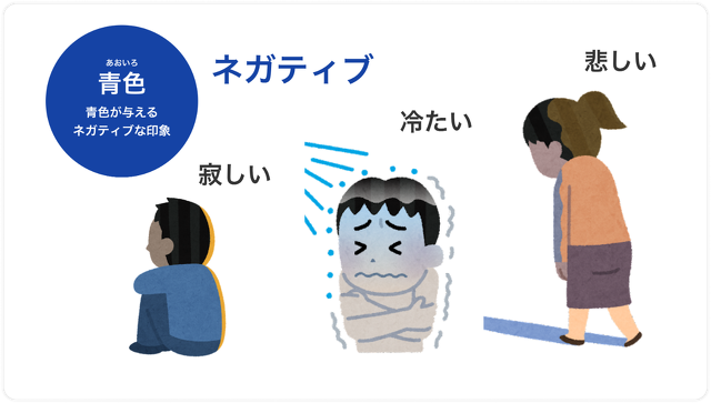 例えば青の場合、ポジティブであれば知性や誠実、清潔の印象を持っています。ネガティブな印象で言うと寂しいや、冷たい、悲しいなどの印象を持っています。