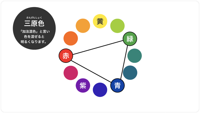 色相環の三原色とは、赤、青、緑のことを指します。これらの色は、光の三原色として知られています。「RGB」はそれぞれの頭文字をとった言葉になっています。