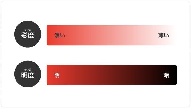 明度は色の明るさの度合いを表しています。より白に近い色は「明るい色」で、より黒に近い色は「暗い色」で、この違いを明度と言います。