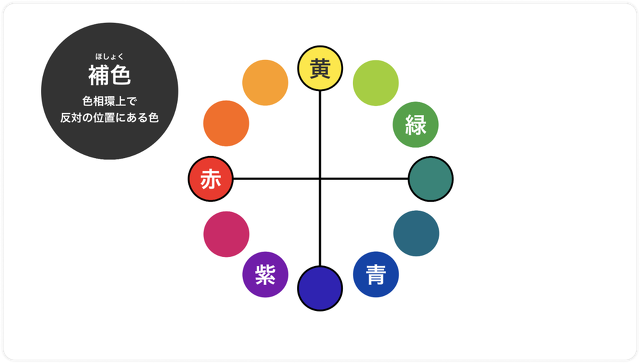 色相環上で反対の位置にある色の組み合わせのことを指します。色と色の差が大きいため、お互いの色を引き立てる効果があります。