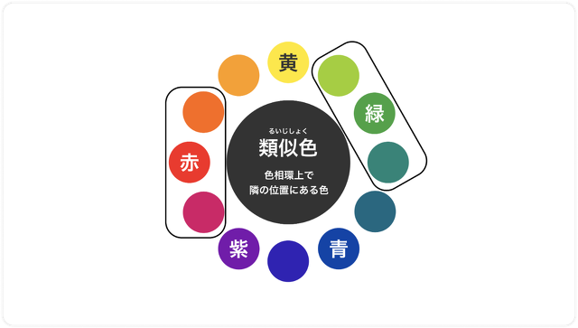 色相環上で隣の位置にある色のことを指します。 色と色の差が小さく色相が見ているため、デザインで使用すると統一感のある配色になります。