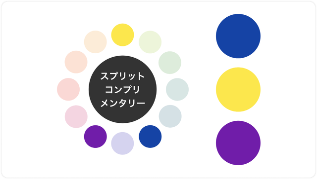 スプリットコンプリメンタリー配色は、色相環の正反対に位置する補色関係の色をとり、片方の色をその色の両隣の色に分けることで、相対性と類似性を持った配色になります。