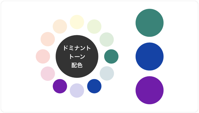 ドミナント・トーン配色は、色相は自由に決めれますが、全体のトーン(彩度と明度)を揃えて統一したイメージでまとめることができる配色技法です。