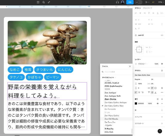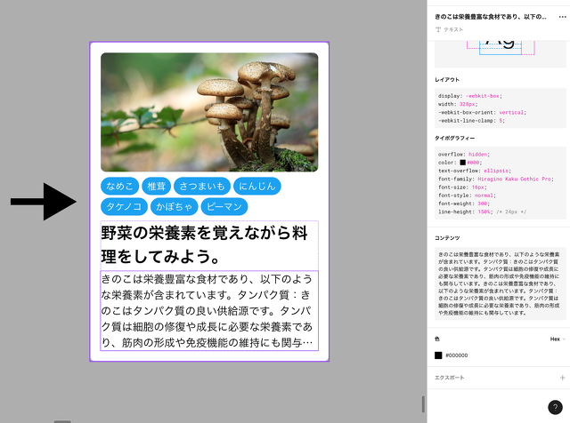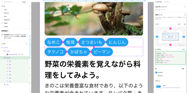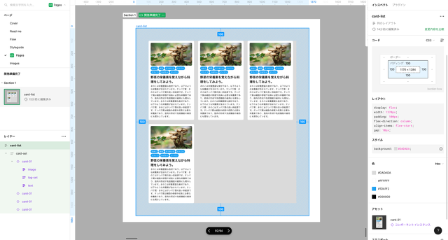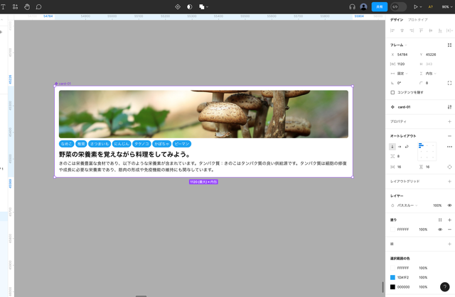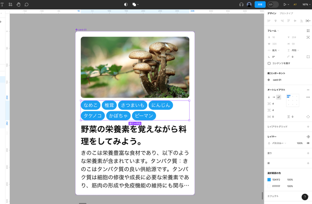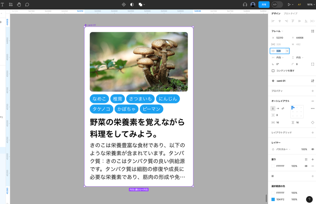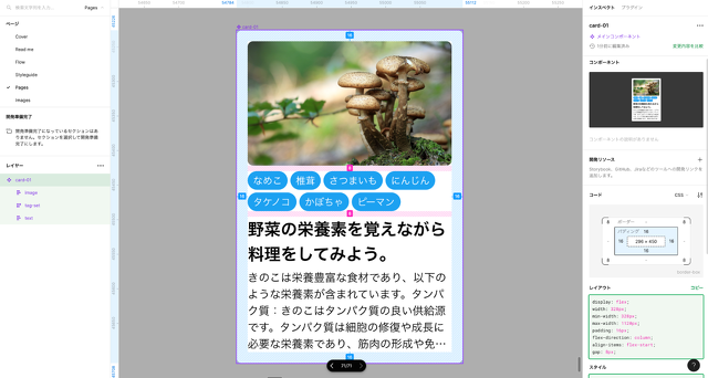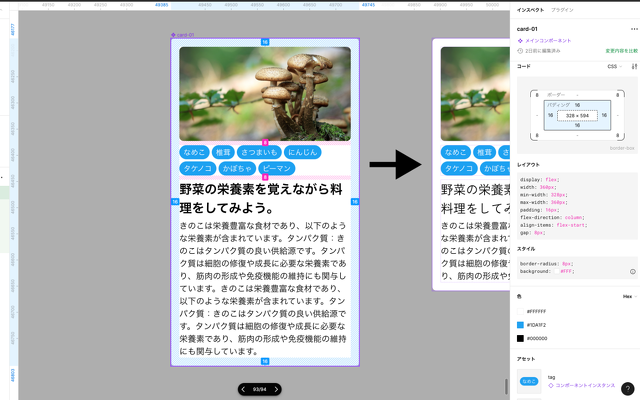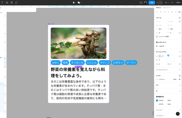 例としてカードスタイルのデザインを用意して試してみました。タグが多い影響でオートレイアウトの幅がカードスタイルの幅よりも超えてしまっています。