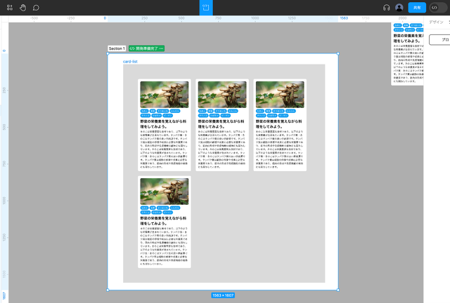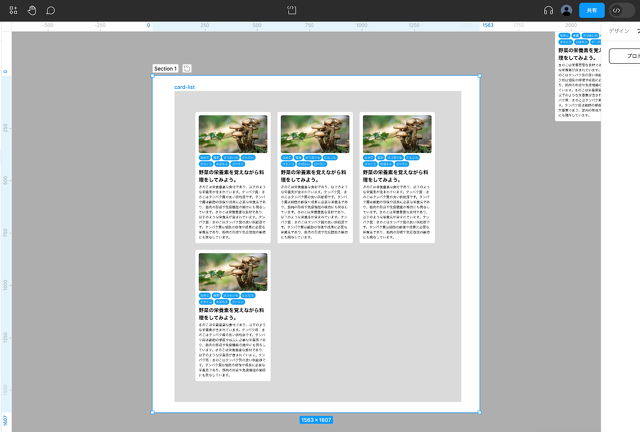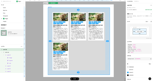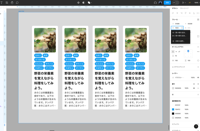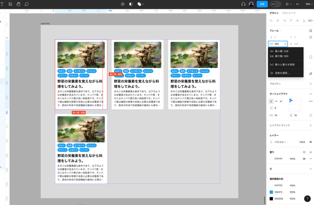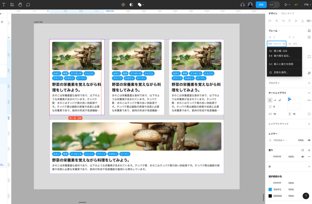 次に最初に紹介した折り返し(Wrap)の機能と組み合わせでカードリストのデザインを作ってみたいと思います。今回カードデザインのコンポーネントやフレーム化の設定の説明は省略させていただきます。