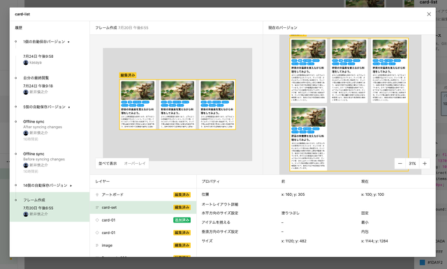 Figmaデータはバージョンで管理されており、ファイル内の変更された部分を確認することができます。右側のメニューにある変更内容の比較(Compare changes)をクリックすると選択したフレームの現在と過去のバージョンを比較することができます。