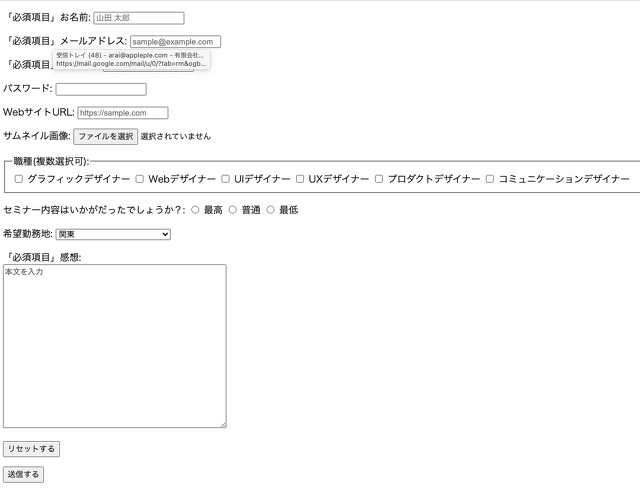 <input type="text" name="title" placeholder="山田 太郎" required>