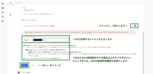 - 「ユニバーサル アナリティクス プロパティの作成」のボタンをクリックし、ONの状態にします。