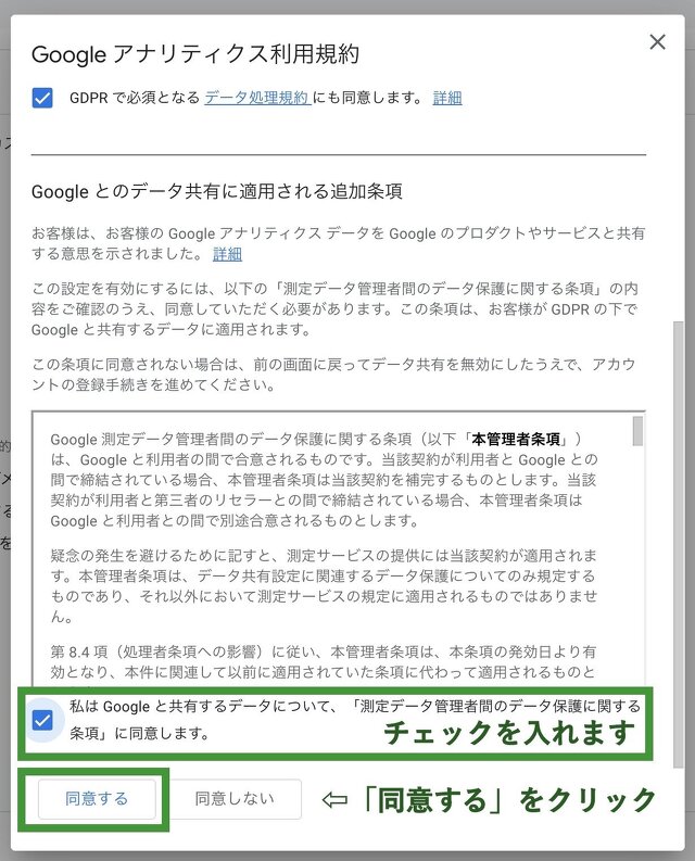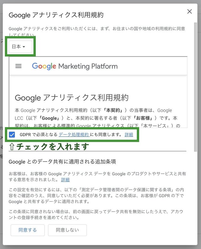 - 利用規約とデータ保護に関する2つチェック項目があるので両方にチェックを入れます。