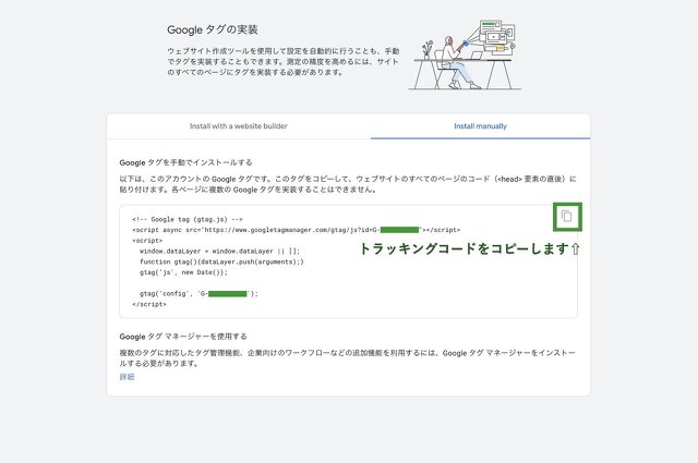 GA4のトラッキングコードと同じようなタグが出てきます。下の画像ように緑の資格で囲っているタグの一部だけコピーします。