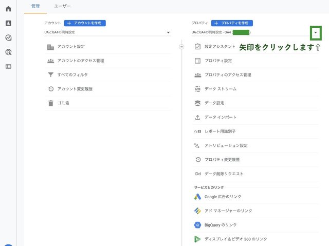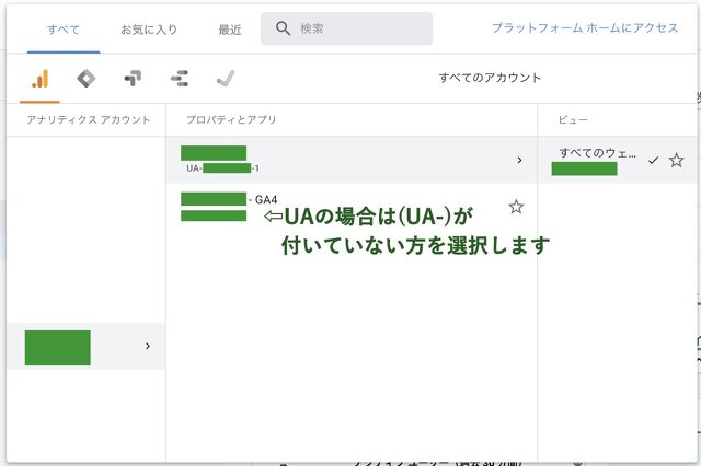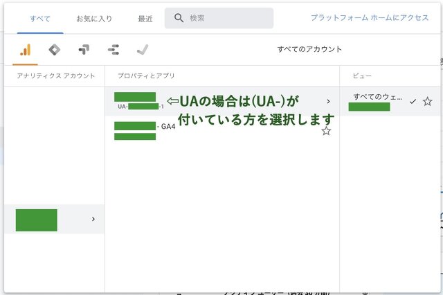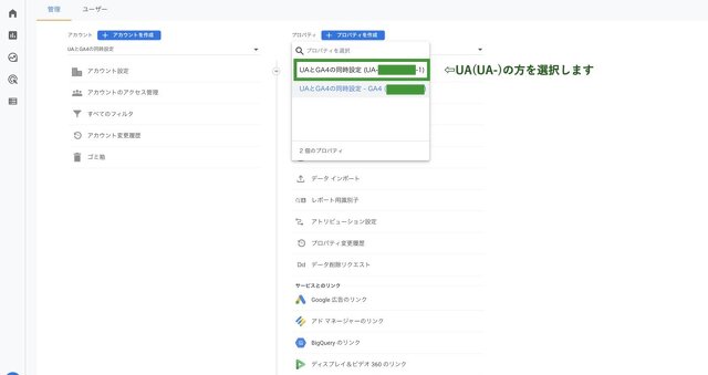次にUAのトラッキングコードを発行するため、プロパティの設定をGA4からUAに変更します。「UA-」がついてない方がGA4のプロパティになので、UAのプロパティをクリックします。