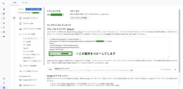 UAのプロパティを開き、プロパティ内の「トラッキング情報 」の中の「トラッキングコード 」をクリックします。
