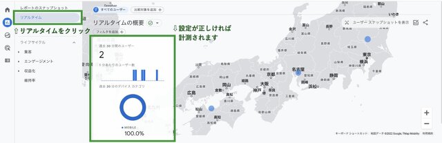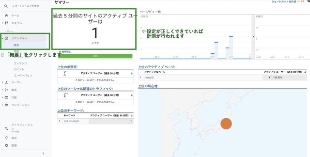 レポートは左のメニューから「リアルタイム」の中の「概要」をクリックするとレポートが表示されます。
